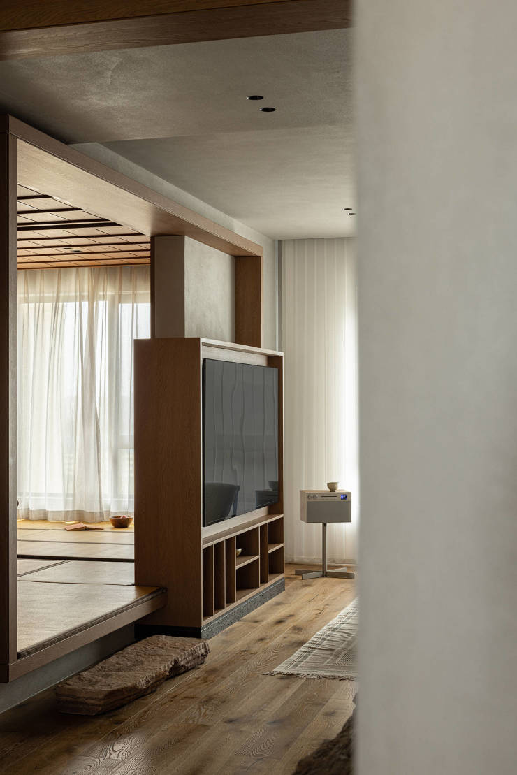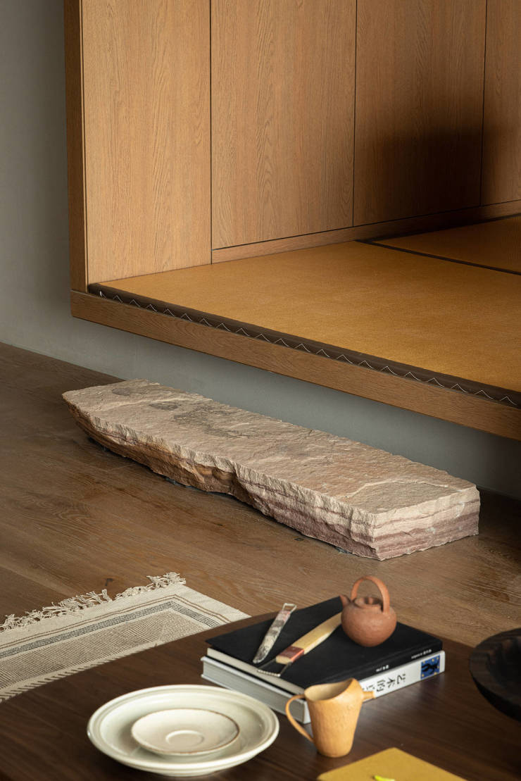 茶室入口延续“木盒子”设计手法,盒子框架突出于同侧墙面,营造出画框般的艺术感。同时地面抬高,将天然岩石置于其下,成为茶室脚踏。