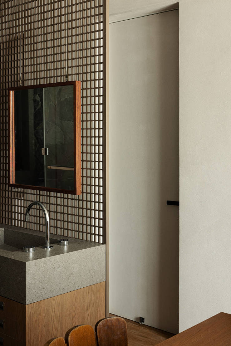 格栅屏风上的装饰画,在另一面则是洗手台的镜子,巧妙的处理简化了冗余物;衣帽间设计L字形顶天立地式衣柜,棉麻质感柜门凸显出业主身上东方含蓄与沉静的气质。