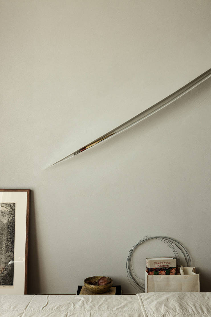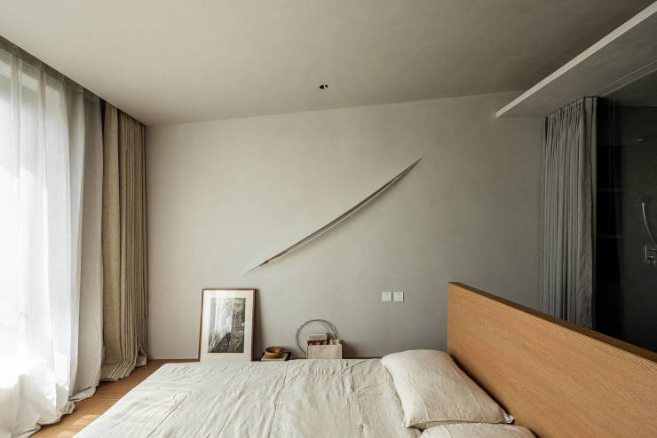 地台床南北朝向放置,木色的床头也是梳妆台的立面。床侧一刀划开的墙面,致敬了空间主义艺术家Lucio Fontana(卢西奥·丰塔纳)的成名画作。巧妙的利用Grg预制工艺复刻到墙面的空间里,宛如雕塑嵌入到平静的墙面里,使其跳至第三维度,形成新的美学设计体验,同时也与玄关处翻起的“书页”一角相呼应。