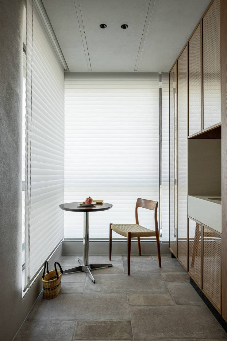 生活阳台有着两面落地窗,享有充沛日光与景色。这里布置了多功能场景,兼具晾晒洗衣、早餐角功能。看见小空间的更多可能性,融入多重生活场景,是空间以小见大的秘密之一。