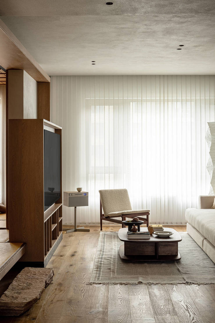 不论动态还是静态,挖掘业主本身与众不同的个性,关照人的五感体验。沙子、石阶、植物、洞石这些自然之物为空间注入了古朴与宁静,营造了温润、闲适、素雅、诗意的空间情绪,从而建构出不同于日常静谧而温馨的家。