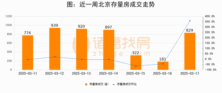 从存量房来看,2025年03月17日北京存量房单日成交829套,比昨日增加648套,环比上涨358%。从近一周存量房成交来看,北京存量房日均成交套数为694套,03月17日单日成交829套,高于近一周平均水平19.5%。