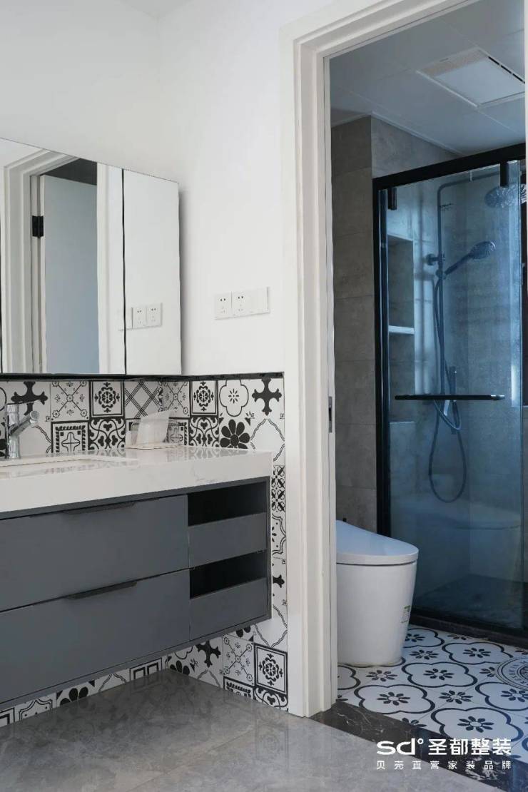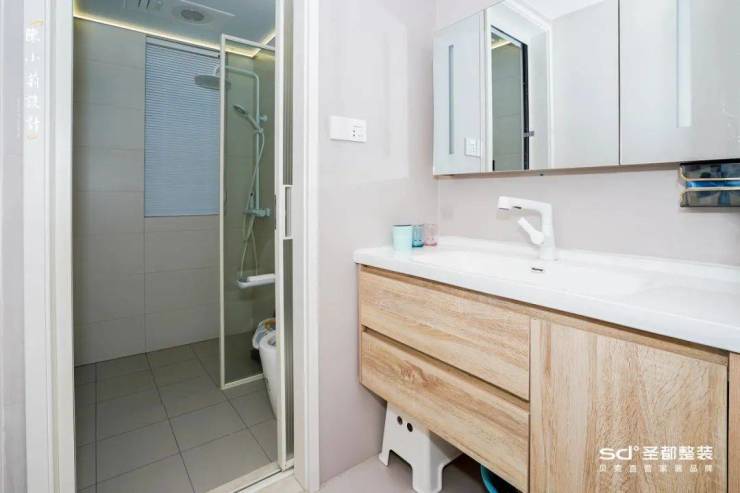 卫生间规划成半开放式,即将洗手台外置,能同时满足两人使用卫生间,进一步提高生活效率。