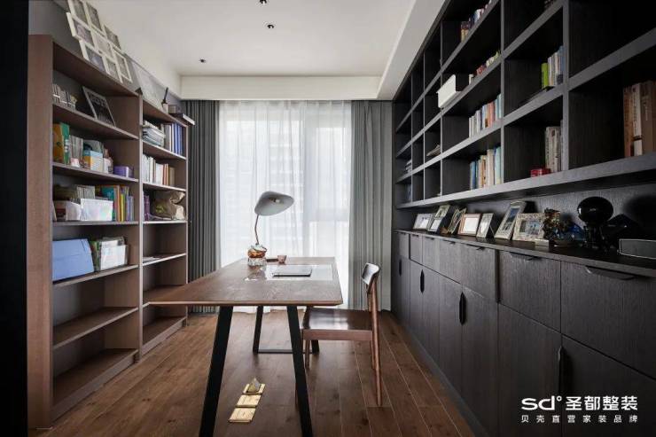 书房设计成半开放式,既能确保一人学习、工作时的专注度,又能让一家人进行一起学习、互动交流。