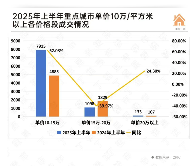 从各单价段来看,单价10万元-15万元/平方米和单价20万元/平方米以上顶豪成交同比均上涨,其中单价10万元-15万元/平方米高端住宅成交了7915套,同比增长62%;单价20万元/平方米以上顶豪共成交了133套,同比增长24%。