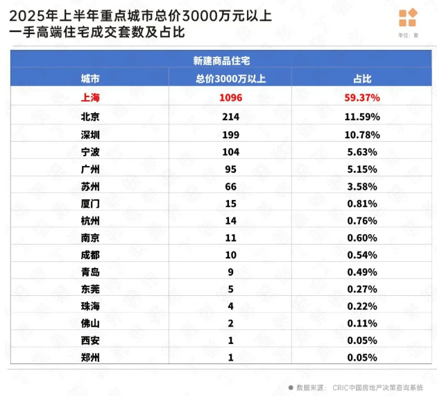 据克而瑞监测数据,2025年上半年上海总价3000万元以上新房成交1096套,占30城总量的59.4%;二手高端住宅成交336套,占比46.2%。若从总价5000万元以上占比来看,上海的占比还要高,其中一手成交482套,占30城总量接近八成。