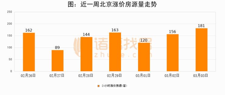 根据诸葛找房数据显示,北京24小时涨价房源量为181套,较03月02日增加25套,环比上涨16%。与此同时,涨价房源占比小幅扩大,业主信心有所提升。