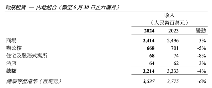 恒隆内地物业租赁组合方面,以人民币计算,商场收入约24.14亿元,同比减少3%;办公楼收入约6.68亿元,同比减少5%;住宅及服务式寓所收入约0.68亿元,同比减少8%;酒店收入约0.64亿元,同比增长3%。