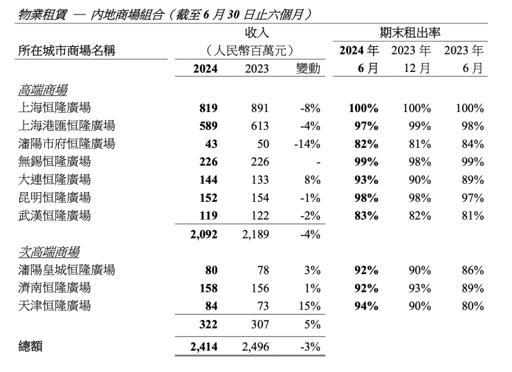 业绩报告披露的数据显示,2024年上半年,恒隆集团物业租赁总收入约51.51亿港元,同比减少6.7%。其中内地物业租赁收入约35.37亿港元,同比减少6.3%;香港物业租赁收入约16.14亿港元,同比减少7.67%。