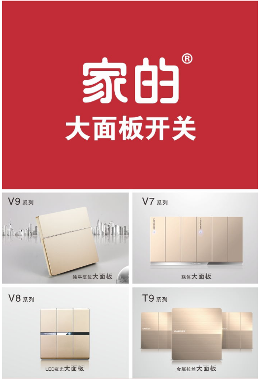 在V8引爆市场的基础上,家的正式提出了“大面板开关”新品类概念,并将之与品牌绑定。2017年,家的围绕着将“大面板开关”产品系列升级的目标,分别开发了“金属大面板开关”T9及“联体大面板开关”V7系列,实现了“大面板开关”的全品项覆盖。