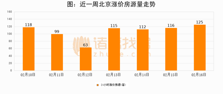 根据诸葛找房数据显示,北京24小时涨价房源量为125套,较02月15日增加9套,环比上涨7.8%。与此同时,涨价房源占比小幅扩大,业主信心有所提升。