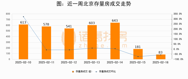 从存量房来看,2025年02月16日北京存量房单日成交83套,比昨日减少98套,环比下降54.1%。从近一周存量房成交来看,北京存量房日均成交套数为463套,02月16日单日成交83套,低于近一周平均水平82.1%。