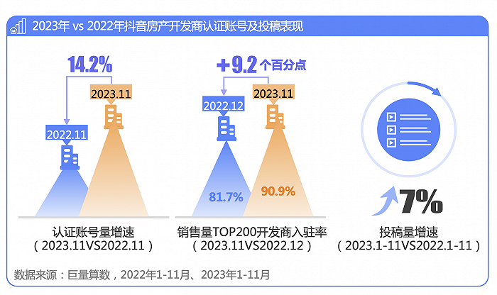 《2024抖音房产生态白皮书》的数据显示,目前直播已经成为房产行业常态化经营的方式之一。2023年抖音房产开发商认证账号、投稿量双增,截至2023年11月,销售量TOP200的开发商入驻率提升至90.9%,比2022年入驻率高出9.2%。