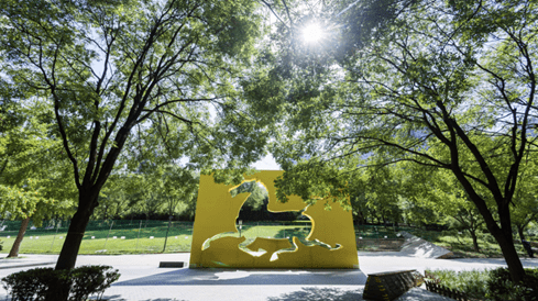 公园内的标志性雕塑,将中国传统文化与西方艺术完美融合。尤其是法国知名雕塑大师萨沙·索斯诺的作品《奔向宁静的晨曦》,以中国东汉青铜艺术“马踏飞燕"为创作灵感,为CBD的都会景观带来趣味与生机。