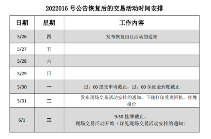 《通知》提到,根据上海市疫情防控工作整体安排,现恢复上海市国有建设用地使用权出让沪告字[2022]第016号公告的出让活动,本公告地块均采用挂牌方式出让,有效申请人即为竞买人。此外,5月31日9:00将发布关于本公告现场交易活动安排的通知。