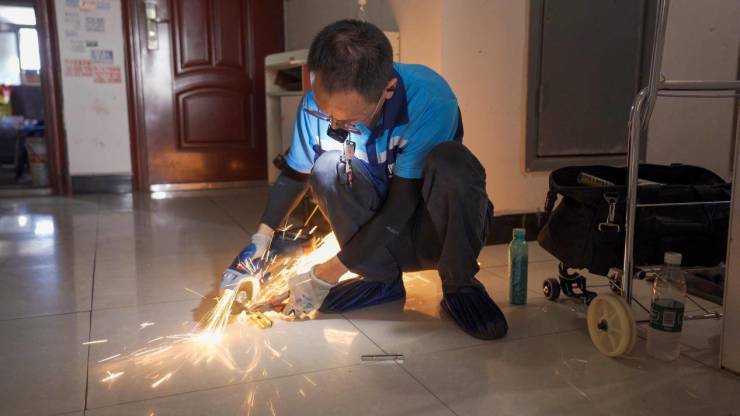 挖孔、开槽,遇到无法拆卸的天地钩还需要固定在里边。周师傅随身携带角磨机,以备不时之需。然而角磨机的使用十分危险,切割时火星四溅,纵使是天气炎热的盛夏也必须全副武装,防护目镜、袖套、厚裤子一样都不能少。