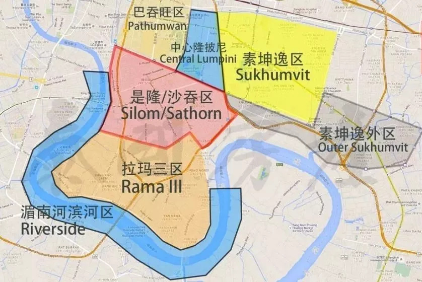 红色区域的Silom-Sathorn是曼谷老牌富人区,也是金融CBD密集区,企业密集、商业配套较为完善,目前该区域的中心位置房价约5-6万人民币/平方。当然了,小编也见过个别在Rama 3 路贴着Sathorn来借光的楼盘打着富人区的旗号来忽悠中国投资者的,报出60-70万的一房总价让你心动不已,试想一下,上海的陆家嘴、新天地;北京的王府井;深圳的南山,可能突然冒出个新楼盘单价只卖2万多的吗!?天上不会掉馅饼,地段在房产价值的体现就是在价格,这一点毋庸置疑!