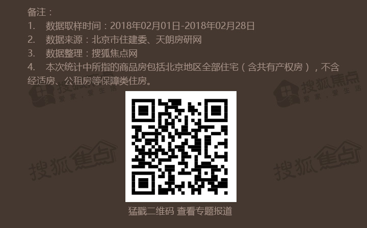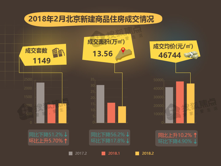 搜狐焦点统计显示,2018年2月北京新建住宅(不含保障房、定向安置房)成交1149套,环比上升5.7%,同比下降51.2%;成交面积约13.56万平方米,环比下降17.8%,同比下降56.2%;成交均价46744元/㎡,环比下降4.9%,同比上涨10.2%。