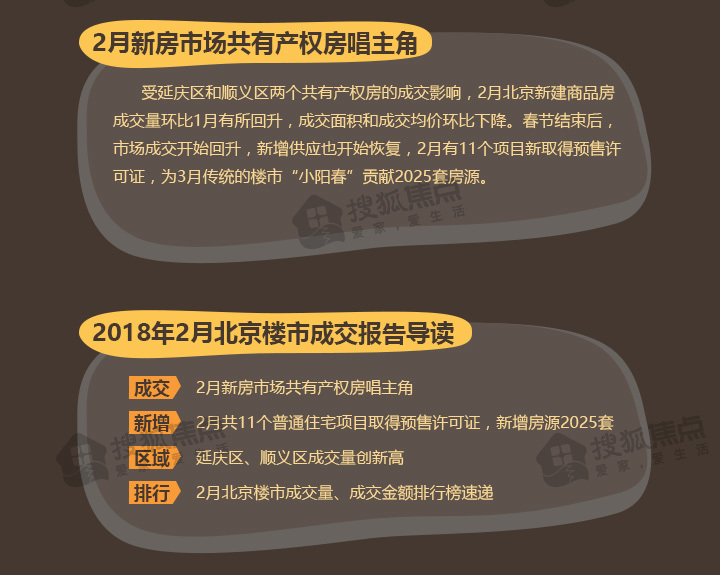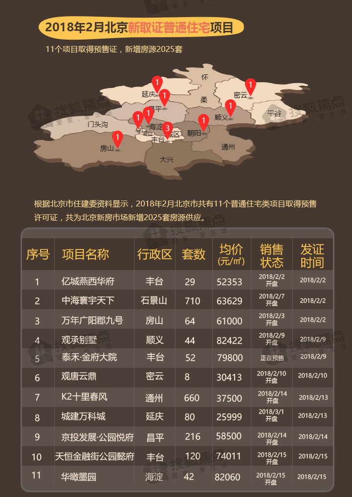 根据北京市住建委资料显示,2018年2月北京市共有11个普通住宅类项目取得预售许可证,共为北京新房市场新增2025套房源供应。
