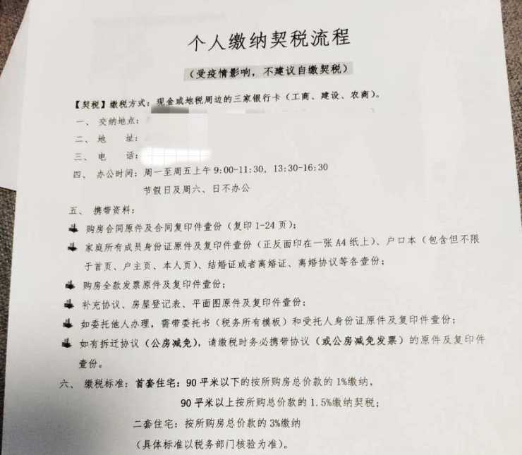 在你验完房没啥问题,确认想收房的时候,可以联系开发商客服,表明想自己交契税,让开发商给准备相关资料。一般需要补充协议、房屋登记表、平面图等资料。资料准备好后,你需要先把房屋的面积差补齐,开发商的工作人员就会给你相关资料,拿着这些资料去房屋所在地的税务局办理手续就行了。焦点君从打电话给开发商到拿到这些资料,大概用了一周多的时间,给大家一个参考。