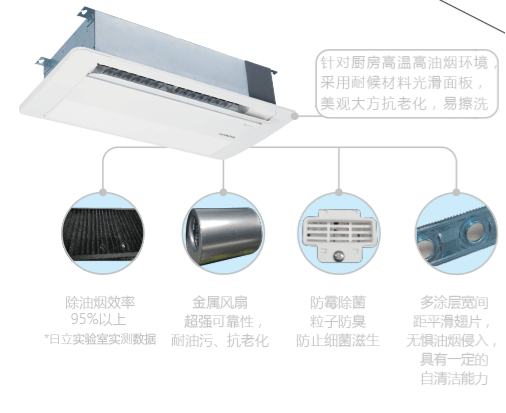 其次,针对于厨房的高油烟环境,日立厨房专用中央空调采用了耐候材料的光滑面板,标配多层高效油烟滤网,除油烟效率高达95%以上。抗老化、耐油污、易擦洗,三体合一,内部采用多涂层宽间距平滑翅片,无惧油烟侵入,防止细菌滋生。同时机身上还设计有新风吸入口,可通过新风处理设备直接引入新鲜空气,保证室内空气清新。除此之外,小巧的日立厨房专用中央空调机身厚度仅有192mm,只需要占用吊顶很小的空间,安装很便利。