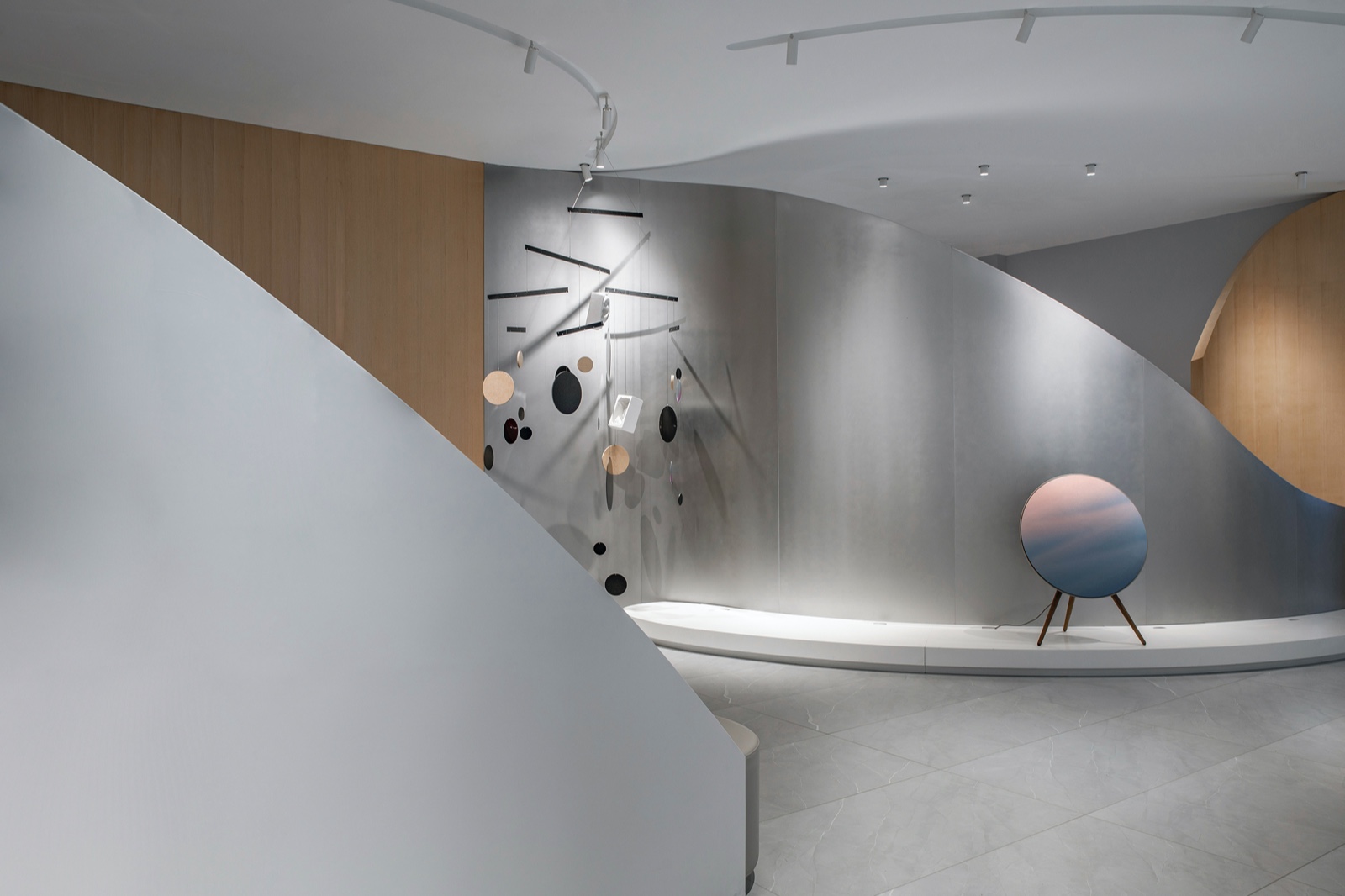 5条以铝板和木质为材料的曲面墙在空间中伫立,而选材是“将吸管插入一台音响”吸取的结果,空间材料与产品的材质构成达成统一,如同步入音响内部,声音也生出具体形态。