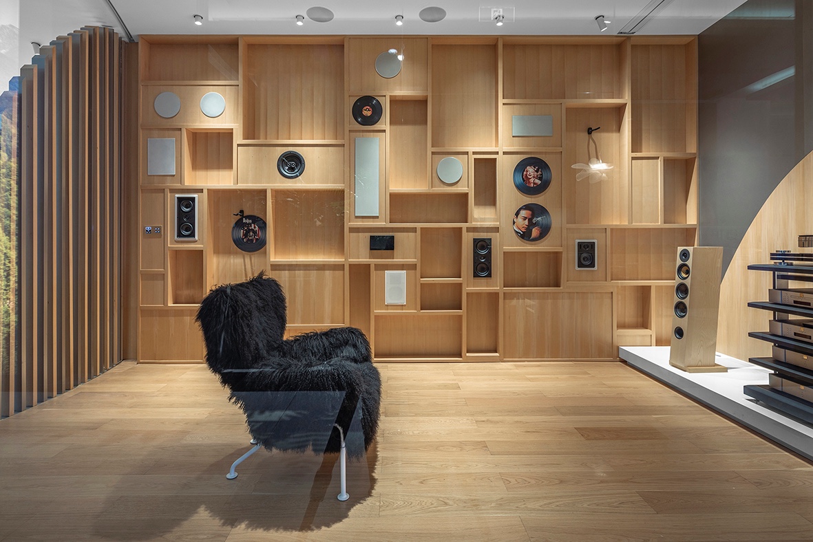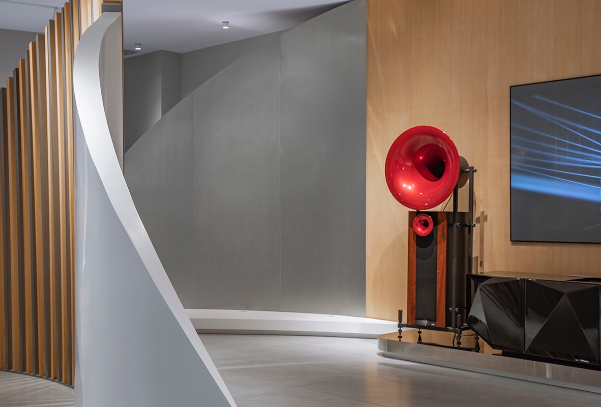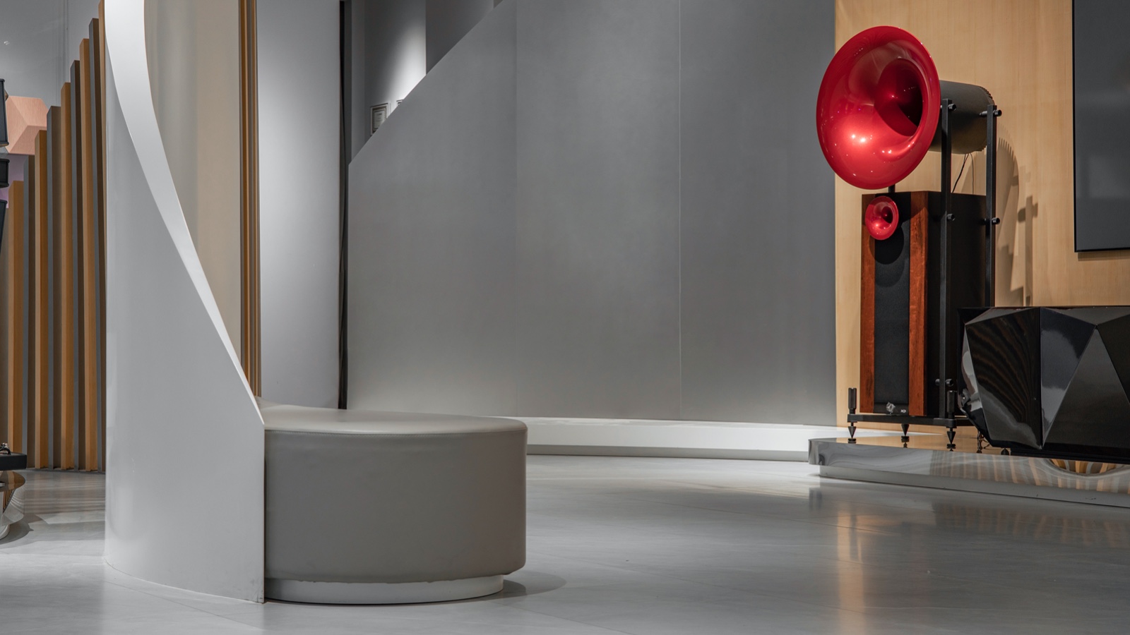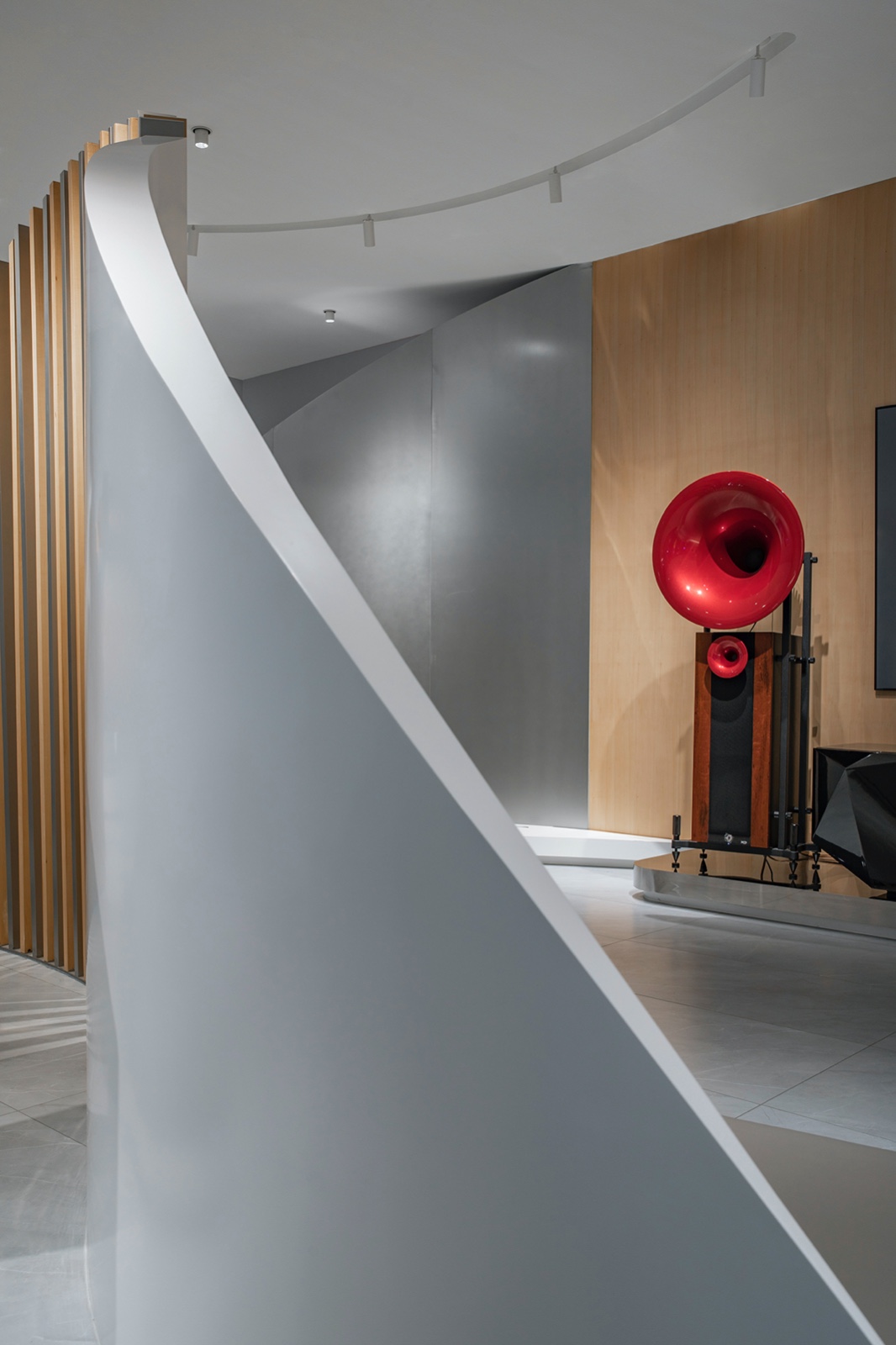 在实体的构建之外,情绪和氛围滑入留白的介质中和声音浇筑在一起。曲线似乎已勾勒出声音轨道;墙面和格栅是光的栖息处;铝合金与木质则干脆把你拉进一只先进音响的身体里,在一无所有的“空”中,已经生出完整。