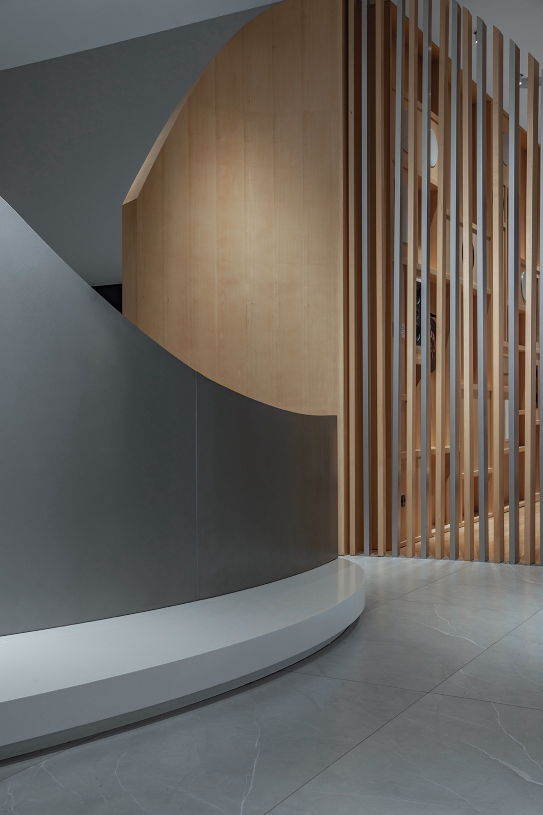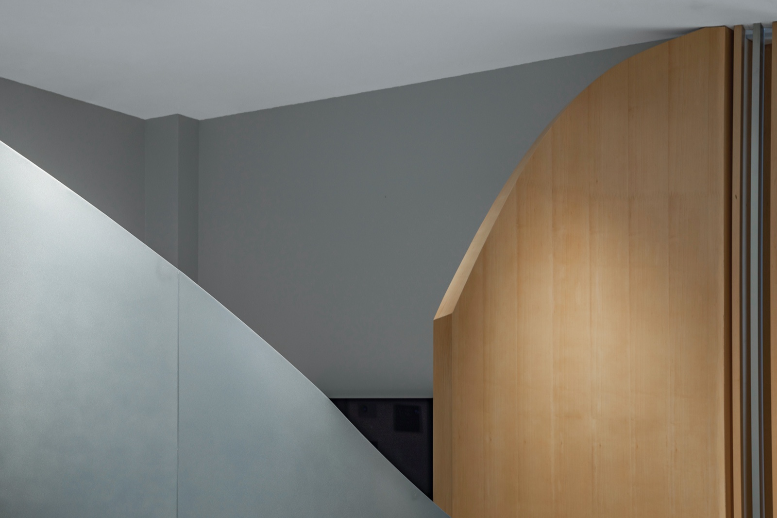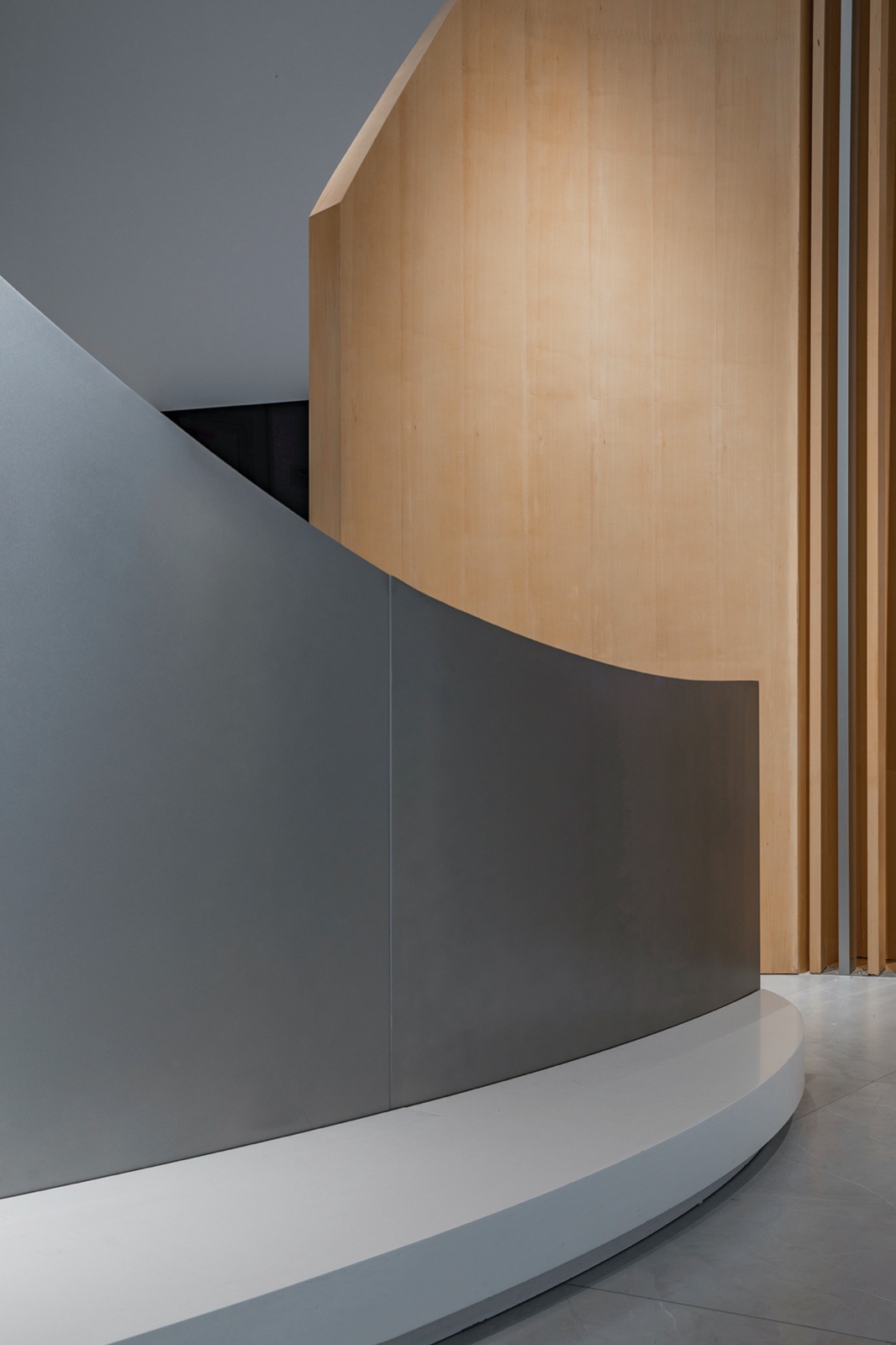 在实体的构建之外,情绪和氛围滑入留白的介质中和声音浇筑在一起。曲线似乎已勾勒出声音轨道;墙面和格栅是光的栖息处;铝合金与木质则干脆把你拉进一只先进音响的身体里,在一无所有的“空”中,已经生出完整。