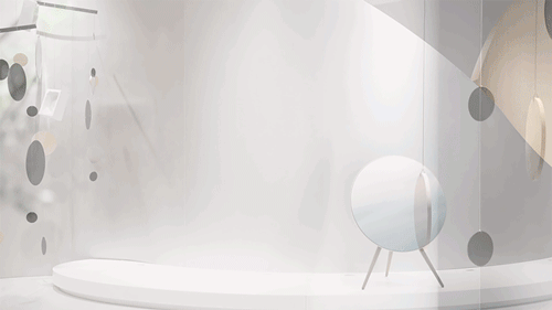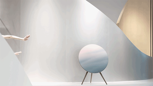你停在一处曲面墙前,淡紫色的夕阳霞光出现在B&O音响表面,画面的来源是一个普通傍晚的落日时分偶然拍下的照片。音响的轮廓将霞光圈在一个完整的圆中,它正以非常缓慢的速度飘散,刚才看到的那一朵云去哪了?你在空中寻找。