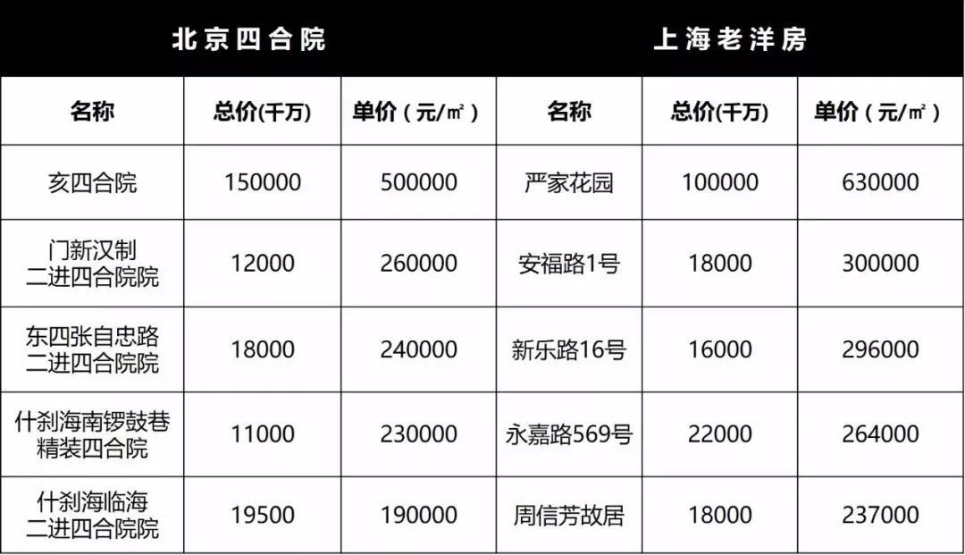 较后,奉上部分市场可售天价四合院和老洋房价格表,究竟谁才是你心中的豪宅之王!
