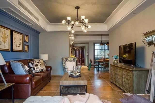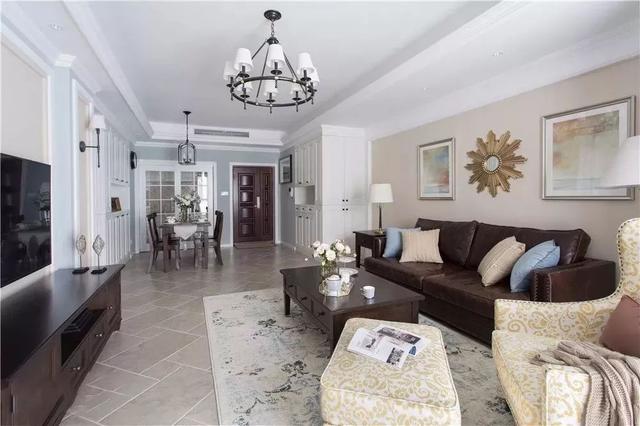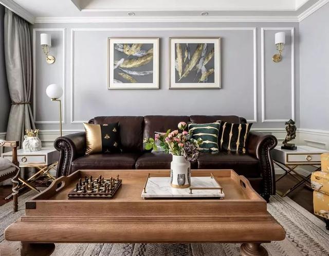 比起驼色,深棕色的皮沙发则是常见于美式风格的搭配中,这样厚重的沙发搭配,能彰显主人的成熟,让客厅显得更加优雅高档,不过这种沙发的体积一般较大,适合较大的空间。