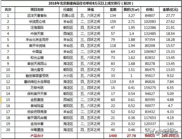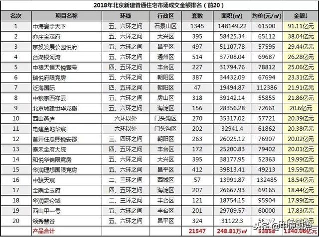 数据显示,2018年包括中海寰宇天下、亦庄金茂府、京投发展公园悦府、中粮天恒天悦壹号、中粮京西祥云、北京城建世华龙樾等18个住宅项目成交额均额突破20亿元大关,18个楼盘中仅瑞悦府限竞房1个限竞房项目。石景山区的中海寰宇天下以91.11亿元的成交额,先进2018年北京新房成交市场排行榜首位,共成交1345套,套均价677万元/套。