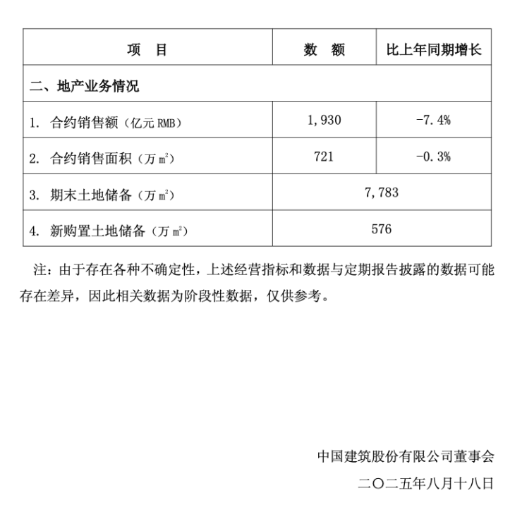 地产业务方面,中国建筑2025年1-9月合约销售额为2553亿元,同比下降2.0%;合约销售面积952万平方米,同比增长0.7%。期末土地储备7497万平方米,新购置土地储备695万平方米。