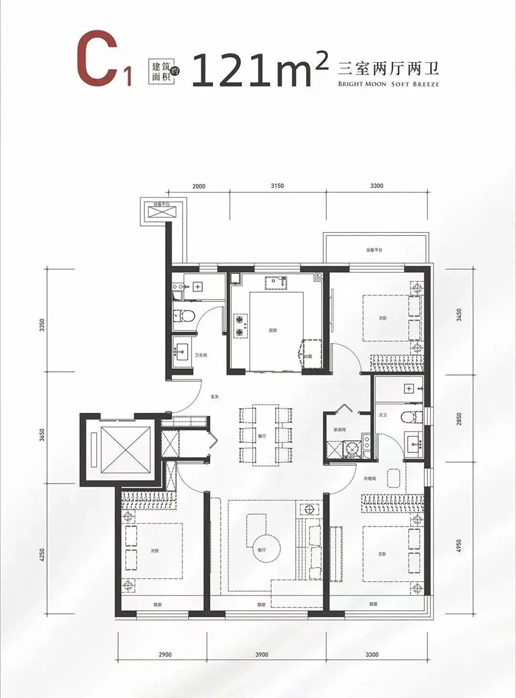 约121㎡的大三居:经典的三面宽+南北通透+全明格局