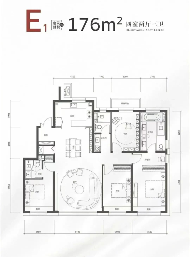 约176㎡的四居大平层:项目的顶配户型,做到了南向四面宽!除客厅外还有三间卧室拥有南向采光,面宽5.1米的超大客厅+落地大窗,视野与采光满分。