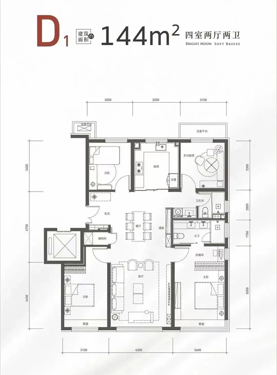 约144㎡的四居双卫,经典的的四叶草布局
