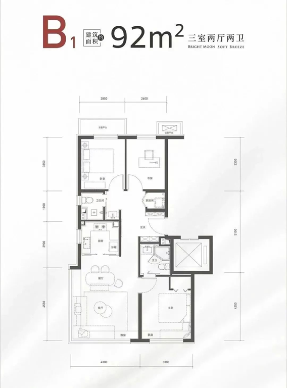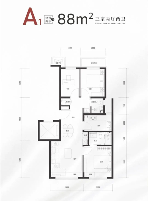 约88㎡的三居双卫:客厅大面宽+双卫的格局,功能性方面点满了。