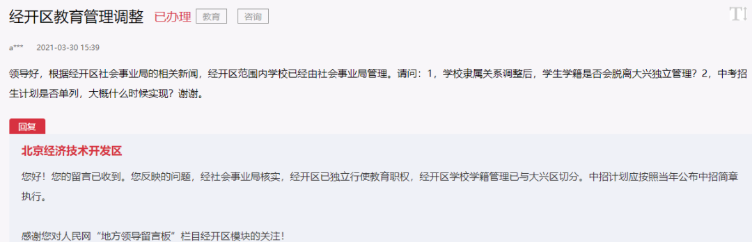 您好!您的留言已收到。您反映的问题,经社会事业局核实,经开区已独立行使教育职权,经开区学校学籍管理已与大兴区切分。中招计划应按照当年公布中招简章执行。