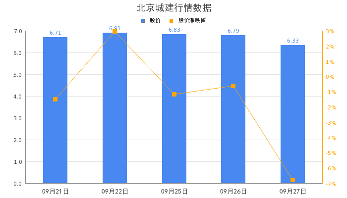 截至09月27日,北京城建(600266.SH)股价收盘6.79元,跌-6.77%,成交总额5.16亿元,总市值142.84亿元。