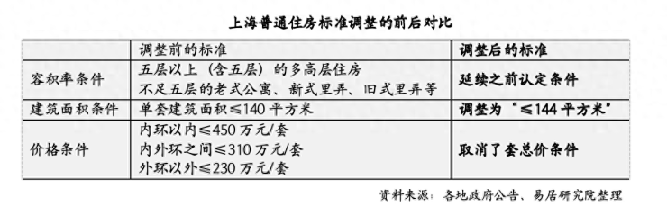 其中,上海对普通住宅的认定标准进行了优化,剔除了价格标准,同时提高了建筑面积标准,从140平方米提高至144平方米。