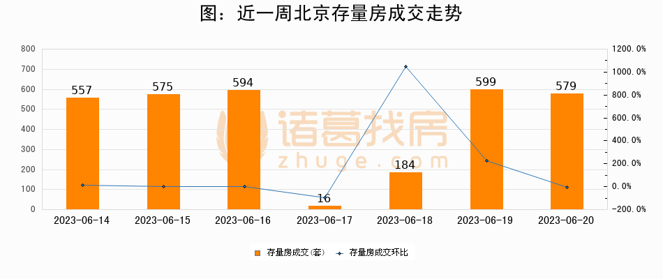 从存量房来看,2023年06月20日北京存量房单日成交579套,比昨日减少20套,环比下降3.3%。从近一周存量房成交来看,北京存量房日均成交套数为443套,06月20日单日成交579套,高于近一周平均水平30.7%。
