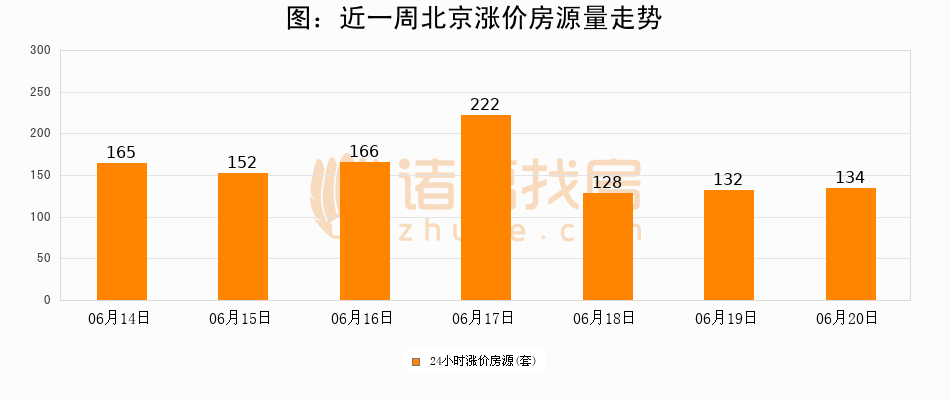 根据诸葛找房数据显示,北京24小时涨价房源量为134套,较06月19日增加2套,环比上涨1.5%。与此同时,涨价房源占比小幅扩大,业主信心有所提升。