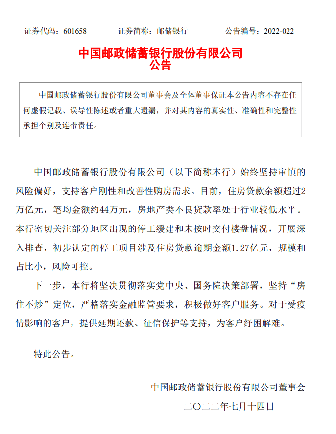 中国工商银行表示,截至2022年6月末,该行个人住房贷款余额6.36万亿元(人民币,下同),不良率0.31%,资产质量稳定。近期,个别房地产开发企业风险暴露,个别楼盘的开发项目出现延期交付的情况。该行高度重视,迅速行动,经排查,目前停工项目涉及不良贷款余额6.37亿元,占全行按揭贷款余额的0.01%,风险可控。