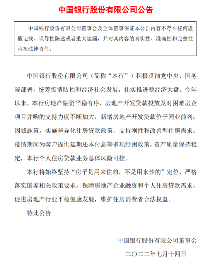 中国银行在公告中说,今年以来,该行房地产融资平稳有序,房地产开发贷款投放及对困难房企项目并购的支持力度不断加大,新增房地产开发贷款位于同业前列;因城施策,实施差异化住房贷款政策,支持刚性和改善型住房需求;疫情期间为客户提供延期还本付息等多项纾困政策,资产质量保持稳定,该行个人住房贷款业务总体风险可控。