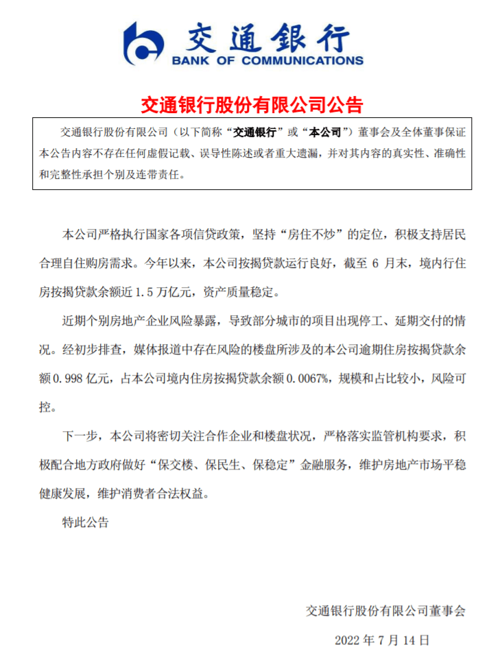 交行公告称,本公司严格执行国家各项信贷政策,坚持“房住不炒”的定位,积极支持居民合理自住购房需求。