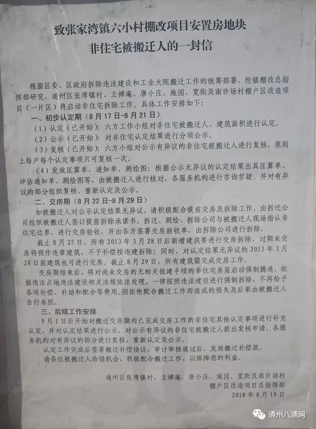 日前,张家湾镇六小村棚改项目指挥部、施园、唐小庄、宽街村委会内张贴了以下公告。