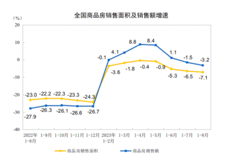 同日,国新办就2023年8月份国民经济运行情况举行发布会。国家统计局新闻发言人、国民经济综合统计司司长付凌晖在会上提到,今年以来,随着经济社会全面恢复常态化运行,一季度,房地产市场有所改善。但受到多重因素影响,二季度以来,房地产市场销售和开发建设整体呈现下行态势。从8月份情况看,房地产市场目前还处在调整阶段,市场销售和房地产投资仍在下降。从投资来看,前8个月,房地产开发投资同比下降8.8%,降幅略有扩大。