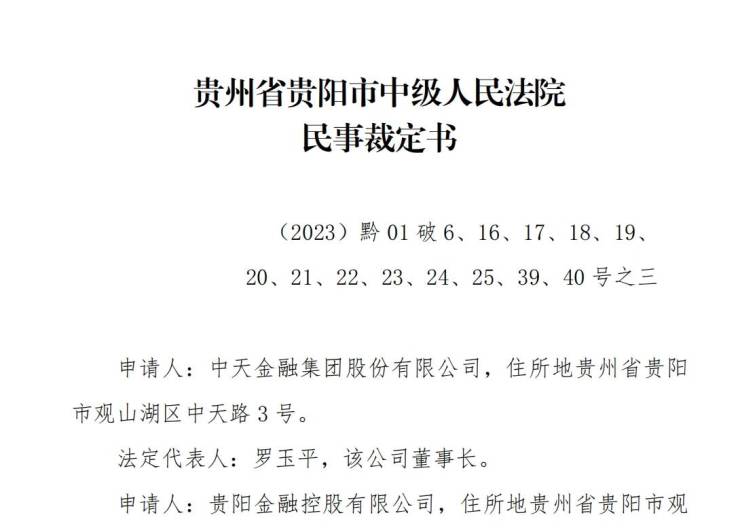 2023年5月4日,贵阳中院对中天金融启动预重整,此后不久,当年7月11日,贵阳中院裁定受理平安银行惠州分行对中天金融的重整申请。