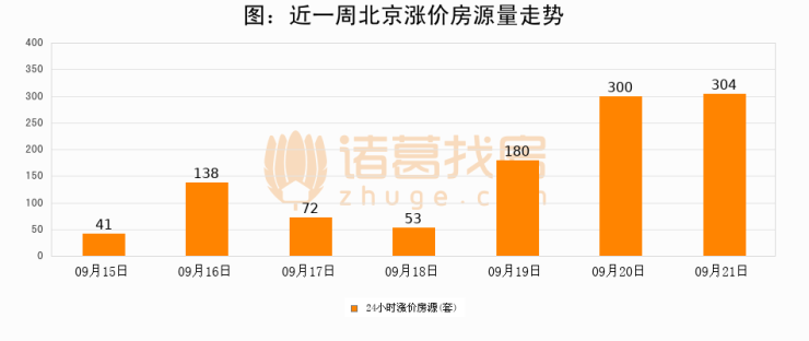 根据诸葛找房数据显示,北京24小时涨价房源量为304套,较09月20日增加4套,环比上涨1.3%。与此同时,涨价房源占比小幅扩大,业主信心有所提升。