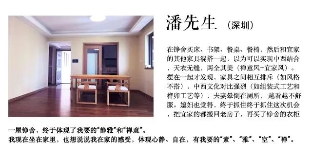 我们买了全宜家的实木,也体现我们要的“简洁”、部分“虚空”,但始终发现家里缺乏灵魂,呆在家里感觉不到“心静”,还是感觉有些“浮躁”,特别是我要“素雅”、“禅意”,完全没有。